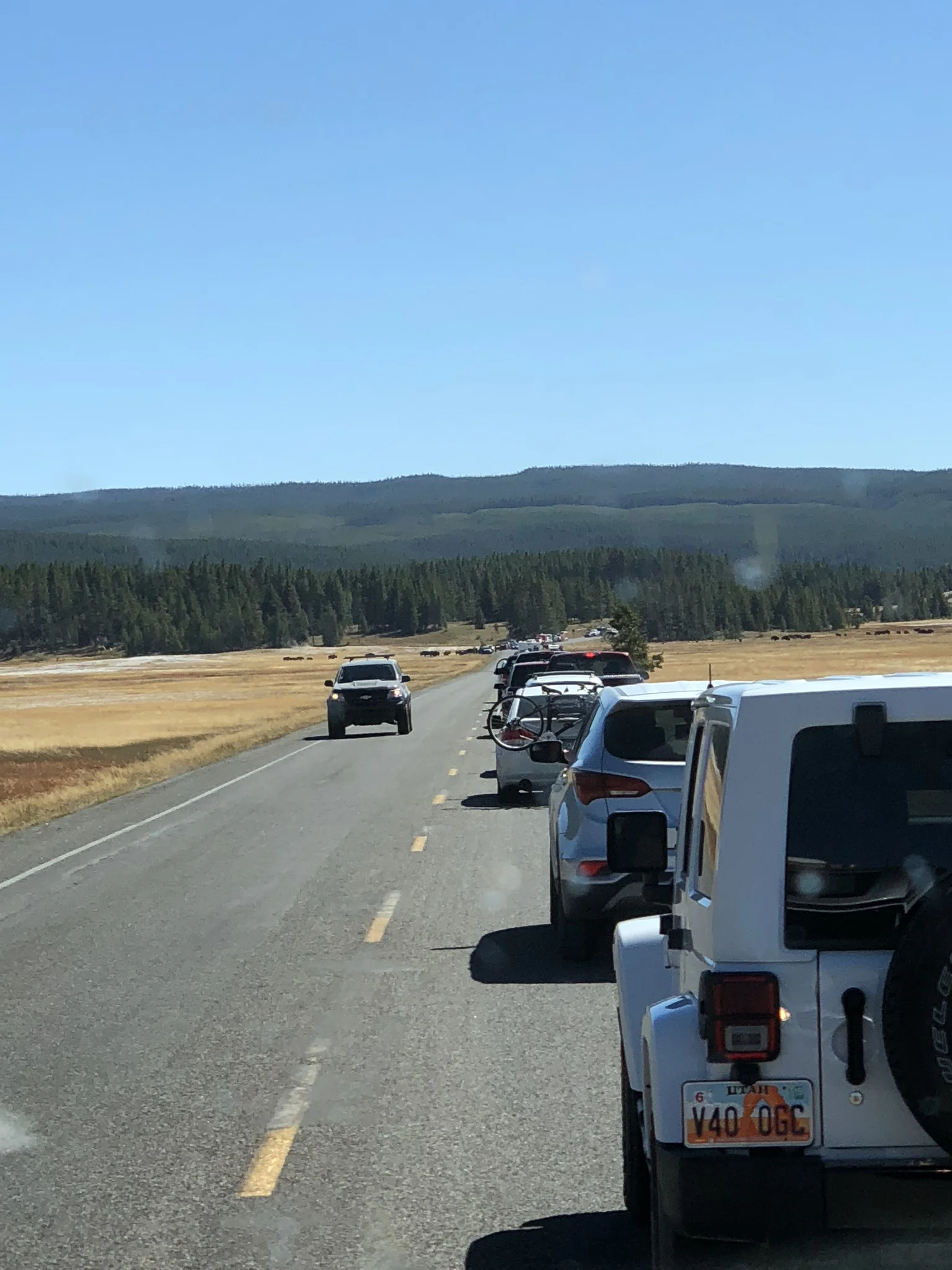 We entered the park at the West entrance and were immediately awestruck by the beauty of the park. We were also dumbfounded at the apparent stupidity of most human park visitors. Huge traffic jams because people see an animal and must stop in the middle of the road to photograph it. The park rules are very clear, but of course, they don’t apply to us, oh no. Let’s delay traffic for 30 minutes to get a picture of the bison crossing the road. If that isn’t enough, let’s completely invade their space to get a picture of us with them. Where is Darwin when you need him?