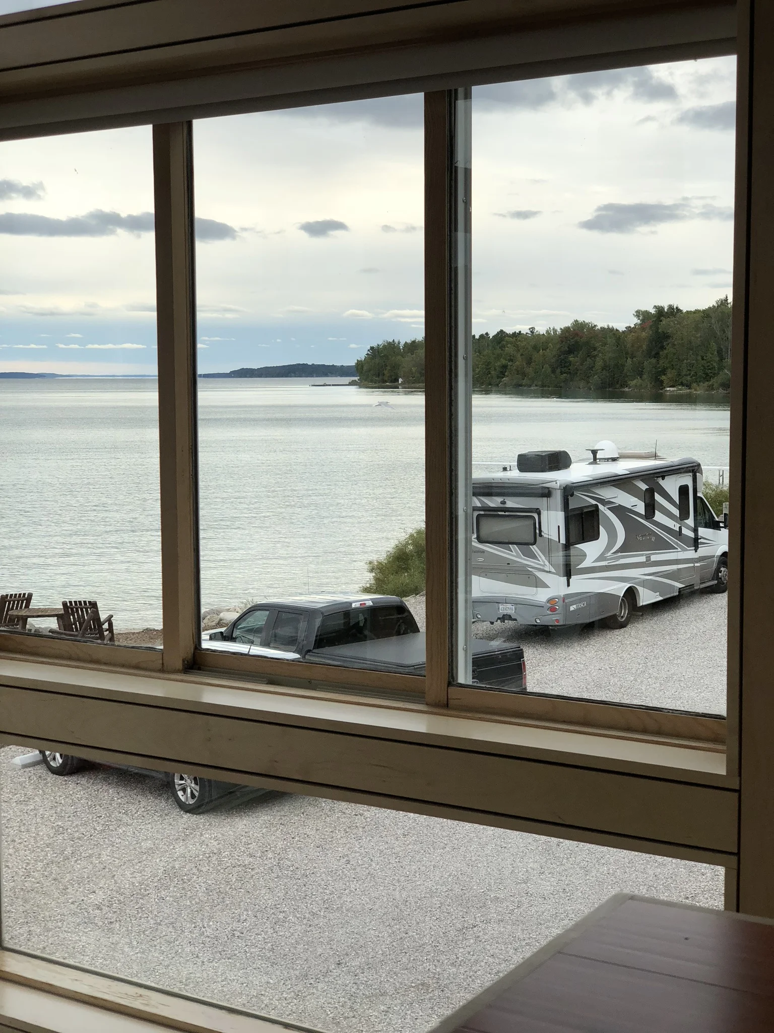 Fortified for the journey, we drove to Leelanau Winery for our first, and last, Michigan wine tasting. The tasting room was beautiful, right on the shores of Lake Michigan. The bar was crowded and there were small shopping carts that people were filling to capacity. They offered a complimentary tasting of 5 wines. They had 43 to choose from, ranging from dessert wine and port, wines made from different fruits, sangrias, sweet white wines, and dry whites and reds...we chose the “dry red” wines. Everyone around us was drinking moscato, blueberry wine, red bubbly, etc...